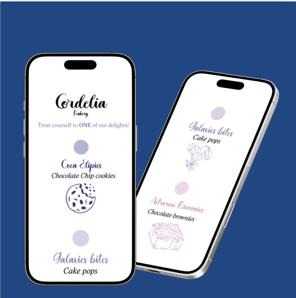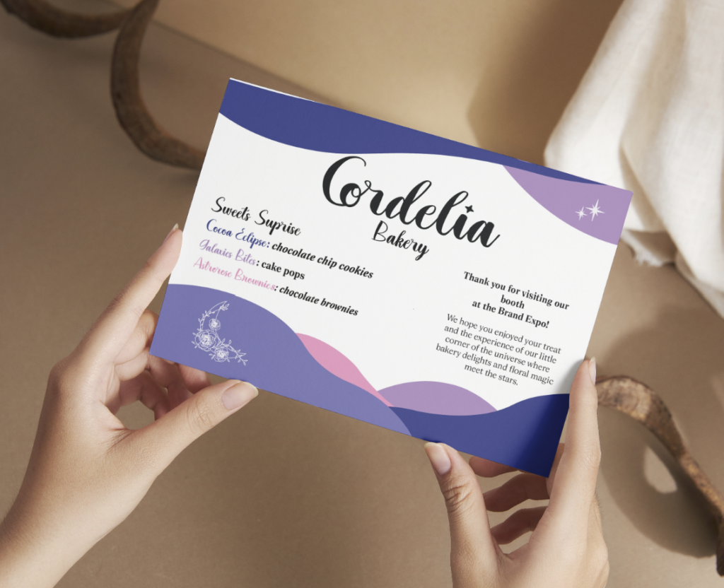 Cordelia is a group branding project my teammate and I worked on. Together, we created a space-themed flower bakery. The name Cordelia was inspired by our research, we discovered that it’s both the name of one of Uranus’s moons and an English rose. I designed the logo, business card, and a set of freebies and goodies for our brand expo.